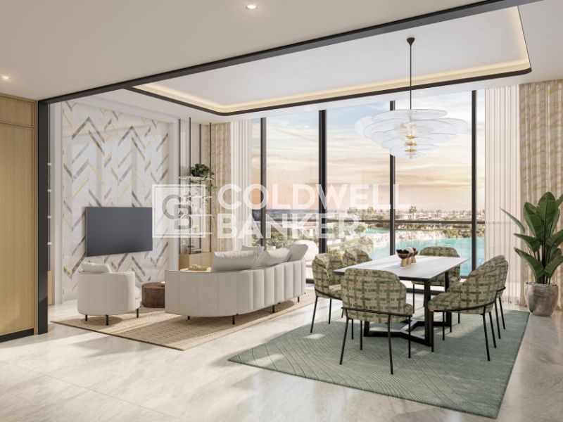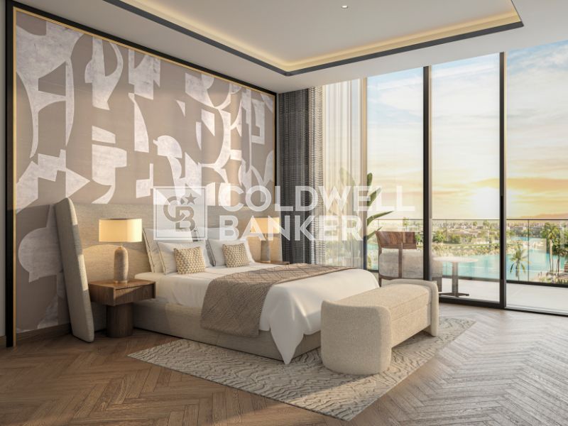 The unit offers a full crystal lagoon view, with an open layout designed to enhance space and natural light. Floor-to-ceiling windows frame the waterfront surroundings, while the layout allows for a seamless flow between living, dining, and relaxation areas.