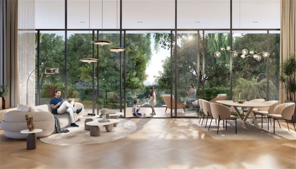 Ghaf Woods is the first forest apartment community in Dubai Enjoy eco-friendly living surrounded by premium amenities at Ghaf Woods. The developer is Majid Al Futtaim, one of Dubai’s largest developers. The community is being designed by world-renowned architects, including the masterminds behind the Burj Khalifa, Royal Atlantis The Palm, Dubai, and One Za’abeel. Ghaf Woods is planned to be one of the top 10 most visited places in the UAE. The community will comprise 11 clusters connected by forest paths. Each cluster will have its own gym and swimming pool. All the residences will offer direct views of the surrounding nature. In Q2 2024, the developer presented the Serra cluster with 1-3 bedroom apartments and 3-bedroom duplexes. They range in size from 675 sq. ft to 3,010 sq. ft. There are two interior styles to choose from – Radiance and Twilight. Layouts include one or more balconies and laundry facilities. All residences, except the one-bedroom apartments, will have a staff room, and duplexes will also have a private pool. Ghaf Woods is an ideal choice for those committed to an eco-friendly lifestyle. There will be 40K trees and 100 species of birds. The air will be 20% cleaner than any other community in the emirate, and the temperature will be 5°C cooler than the surrounding area. The community will be fully pedestrian, with parking located on the ground level.